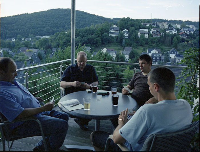 Der Tag begann mit einem Brunch in Siegens „Cafe del Sol“. Wir wurden mit mannigfaltigen Gaumenfreuden verwöhnt. Die folgende Fahrt sollte uns zu dem Ort bringen, an dem alles begann: Haus Lebensquell in Bernshausen bei Bad Laasphe. Vor 25 Jahren verlebten dort vier Jugendliche eine Freizeit und verbrachten eine nicht unerhebliche Zeit mit Kartenspielen im Rittersaal. Die Hutschnur-Geburtsstunde!Nach einer ausgiebigen Besichtigung der alten Wirkungsstätte (mit Kurzwanderung aufgrund der Kälte) fanden geschichtsträchtige Spielrunden im alten Rittersaal statt. Er hatte nichts von seinem Zauber verloren.